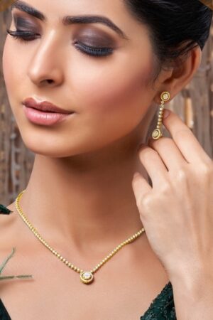 By blending subtle radiance and exquisite craftsmanship in perfect proportions, a coordinated modern or Indian gold necklace set with earrings embodies classic beauty in contemporary style.